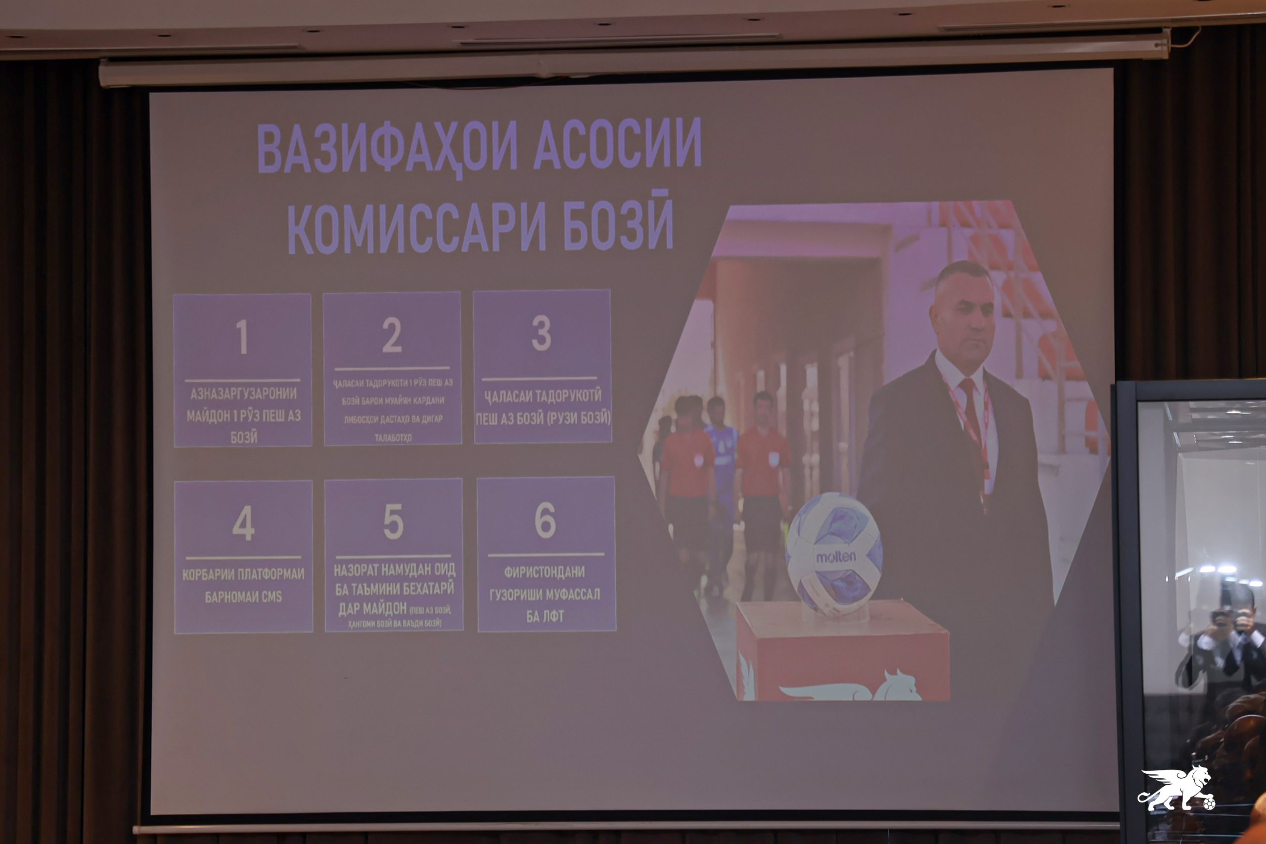 Открывая семинар, вице-президент Федерация футбола Таджикистана Сайвали Дониёрзода поприветствовал всех участников и отметил важность роли комиссаров, которые отвечают за организационные вопросы матчей. Он подчеркнул, что именно от их профессионализма во многом зависит качественное проведение матчей, соблюдение регламента и создание комфортных условий для команд, судей и болельщиков. Также было отмечено, что повышение квалификации комиссаров является неотъемлемой частью системной работы в соревнованиях под эгидой ФЛТ.