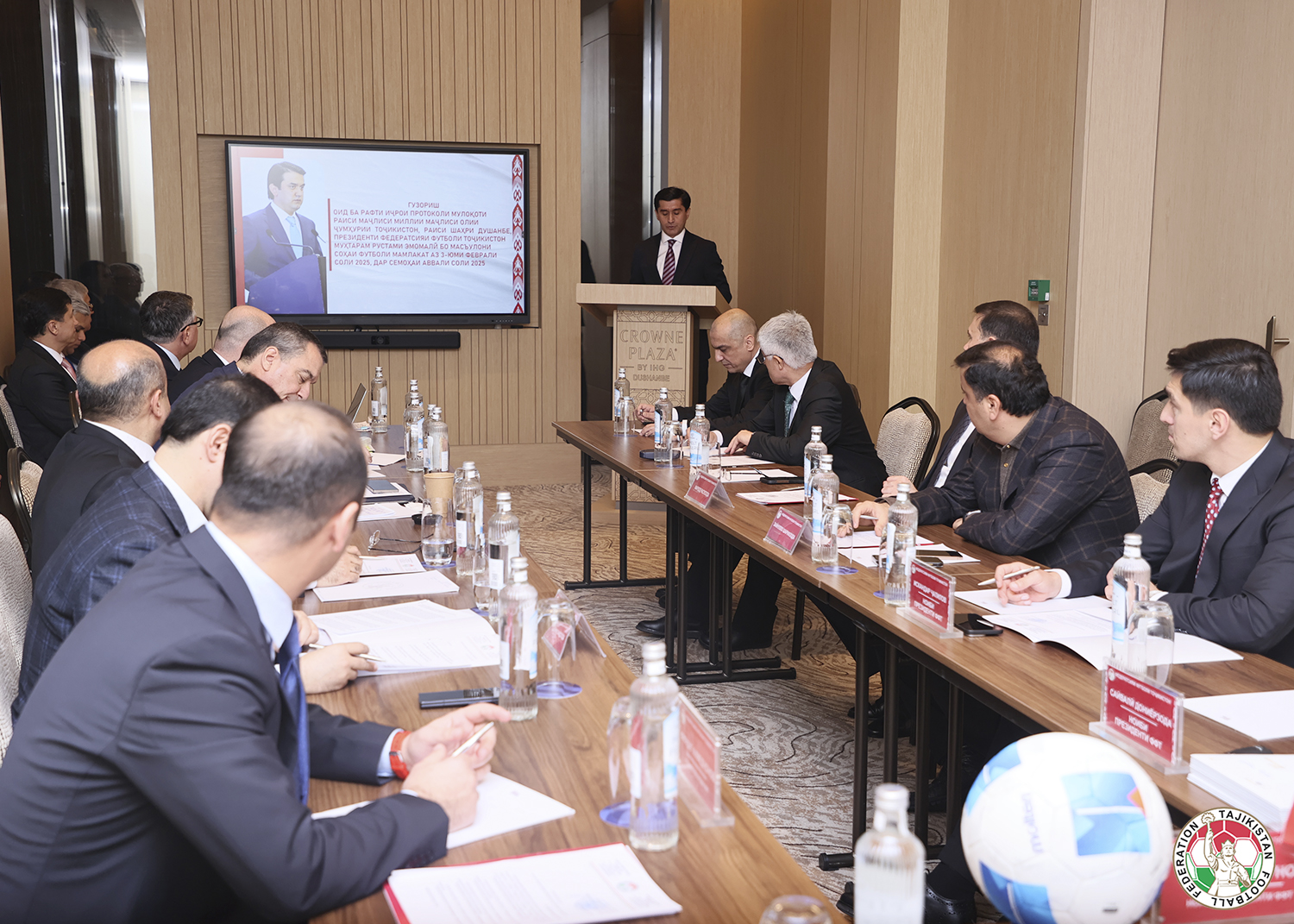 В начале заседания с отчетом о ходе выполнения протокола встречи Председателя Маджлиси милли Маджлиси Оли Республики Таджикистан, Председателя города Душанбе, президента Федерации футбола Таджикистана уважаемого Рустама Эмомали с представителями футбольной общественности, состоявшейся 3 февраля 2025 года, выступил вице-президент ФФТ Сайвали Дониёрзода. В докладе были отмечены достигнутые результаты, реализованные мероприятия, а также обозначены дальнейшие шаги по развитию футбола в стране.